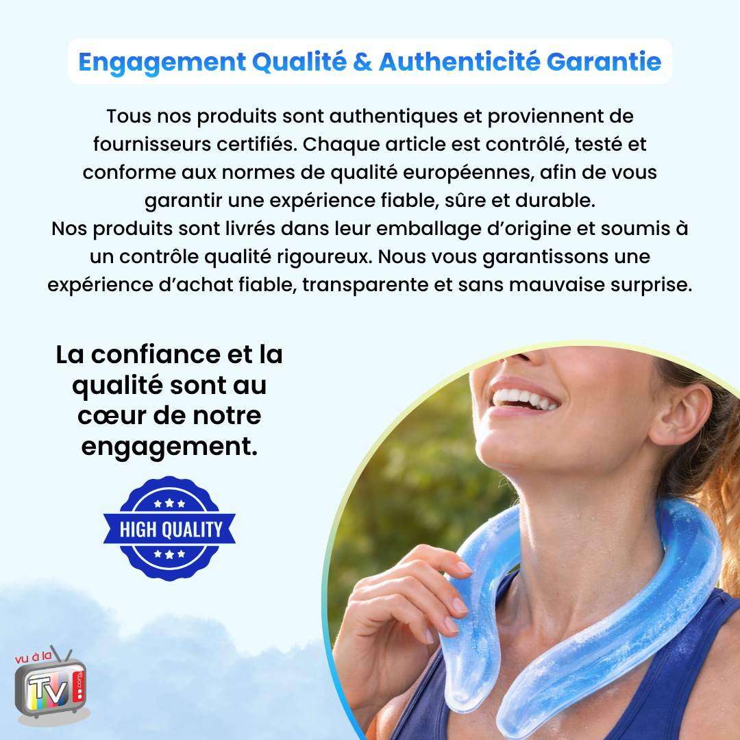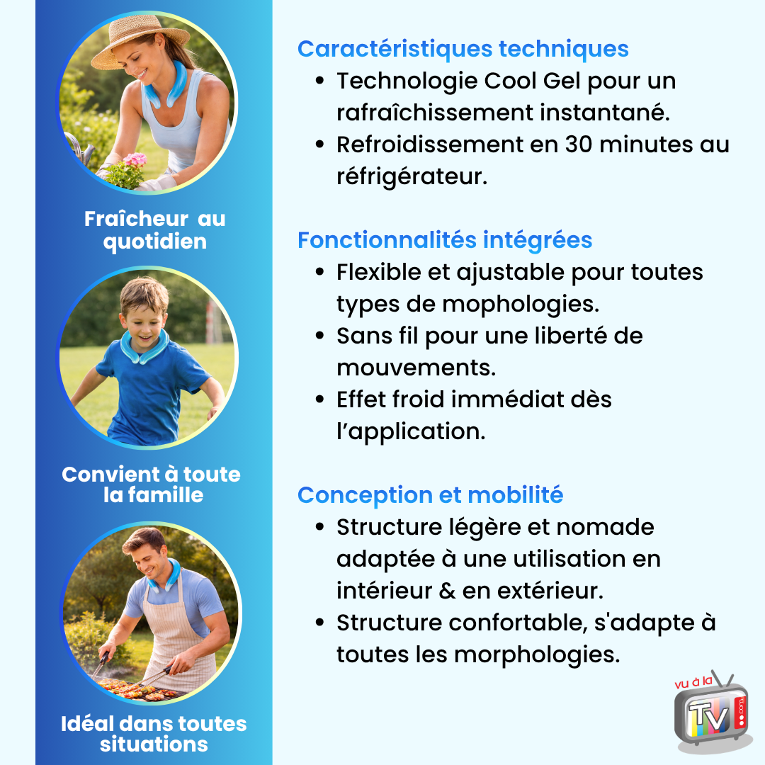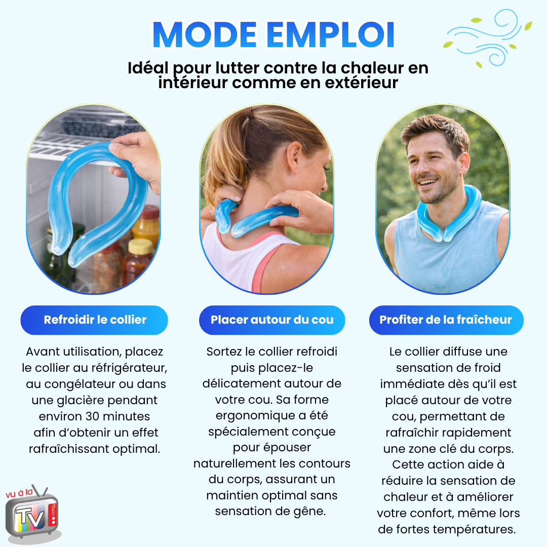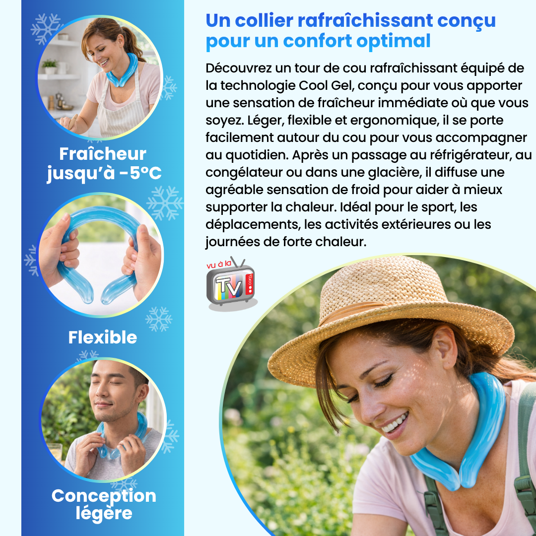 Un ventilateur diffuse de l’air, mais n’agit pas directement sur la température du corps. Un collier rafraîchissant permet une action plus ciblée et immédiate. Une solution avec effet froid au contact et refroidissement continu permet une sensation plus intense.